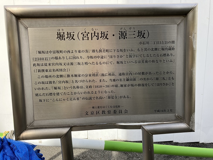 「堀坂は中富坂町の西より東の方。即ち餌差町に下る坂をいふ。もと其の北側に堀内蔵助(2300石)の邸ありしに因れり。今坂の中途に“ほりさか”と仮字にてしるしたる石標あり。此坂は従来宮内坂又は源三坂と唱へたるものにて。堀坂といへるは其後の称なりといふ」(「新撰東京名所図会」)。この場所の北側に旗本堀家の分家利直(後に利尚、通称宮内)の屋敷があったことから、この坂は別名「宮内坂」と名づけられた。また、当地の名主鎌田源三の名から「源三坂」ともいわれた。「堀坂」という名称は、文政(1818年〜1830年)の頃、堀家が坂の修復をして「ほりさか」と刻んだ石標を建てたことからいわれるようになった。坂下に“こんにゃくえんま”の伝説で名高い「源覚寺」がある。