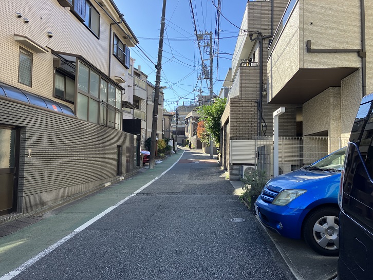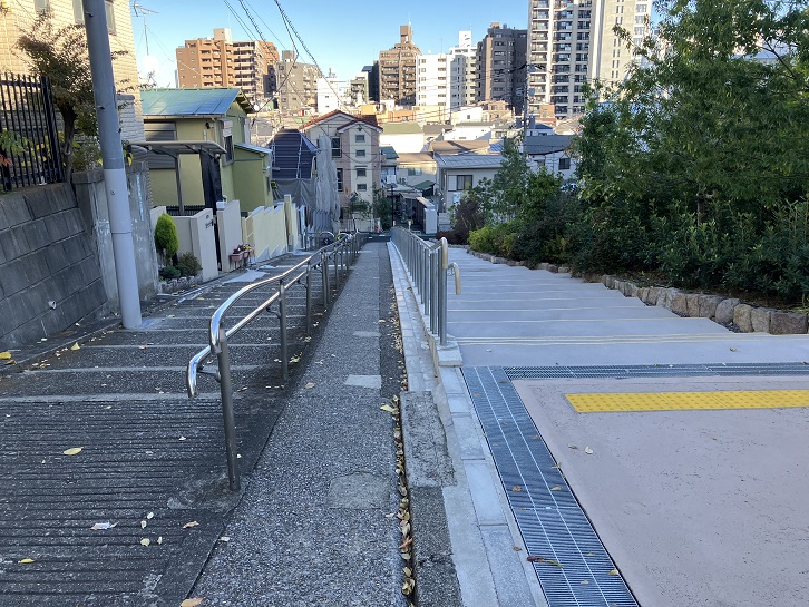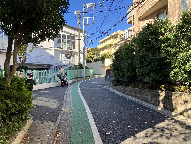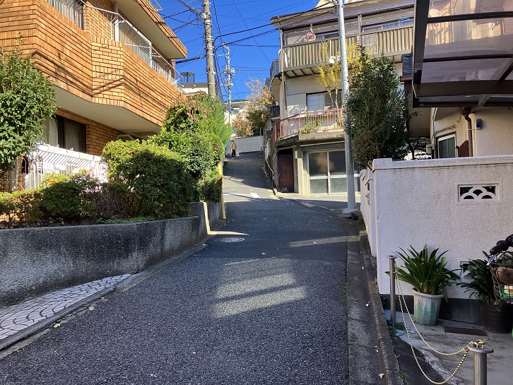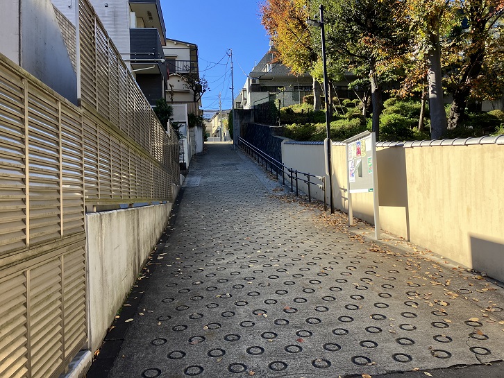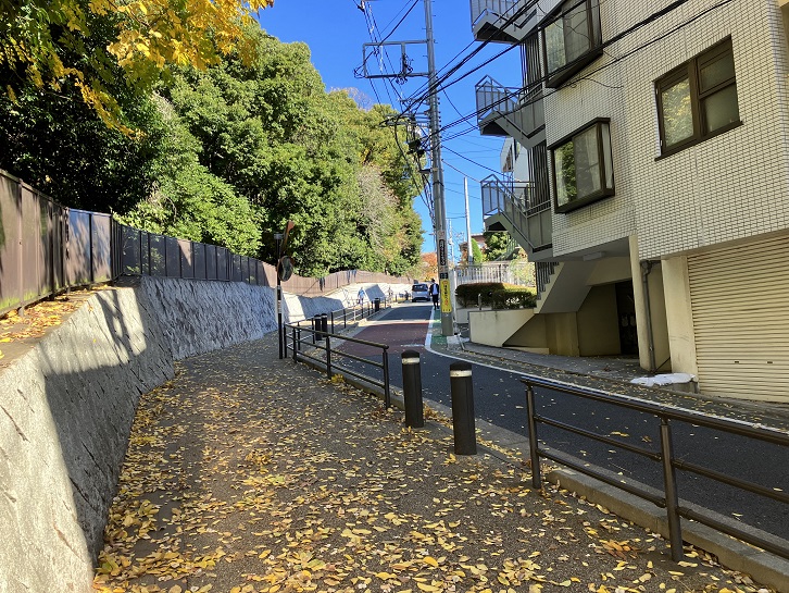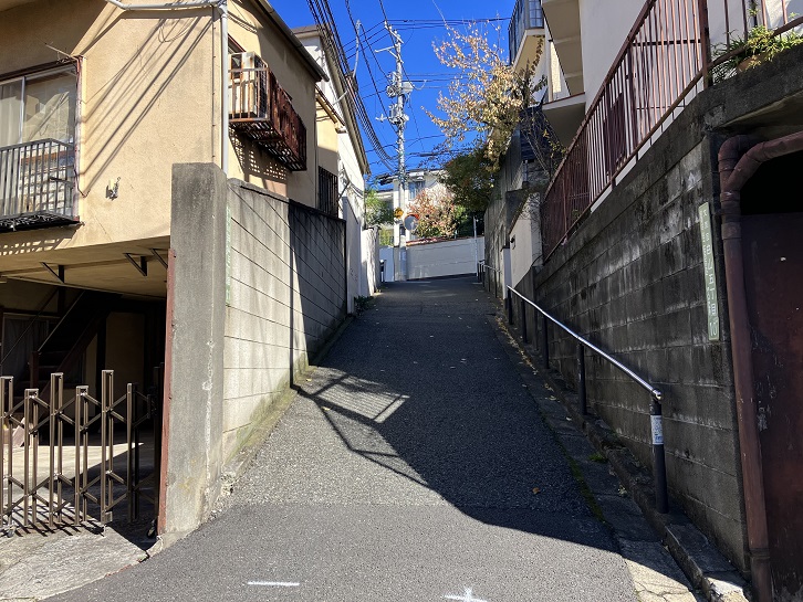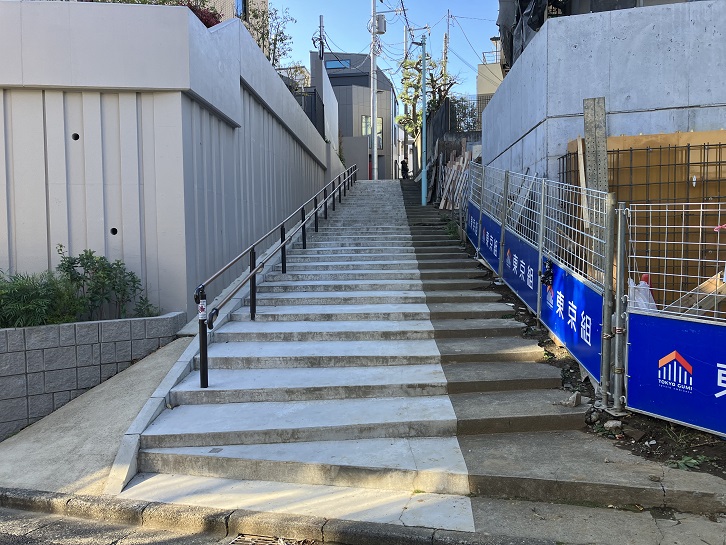 第八中学校に隣り合って、崖下に汐見小学校があります。藪下通りを挟んだ反対側の斜面のマンションと民家の間に階段が上がっています。