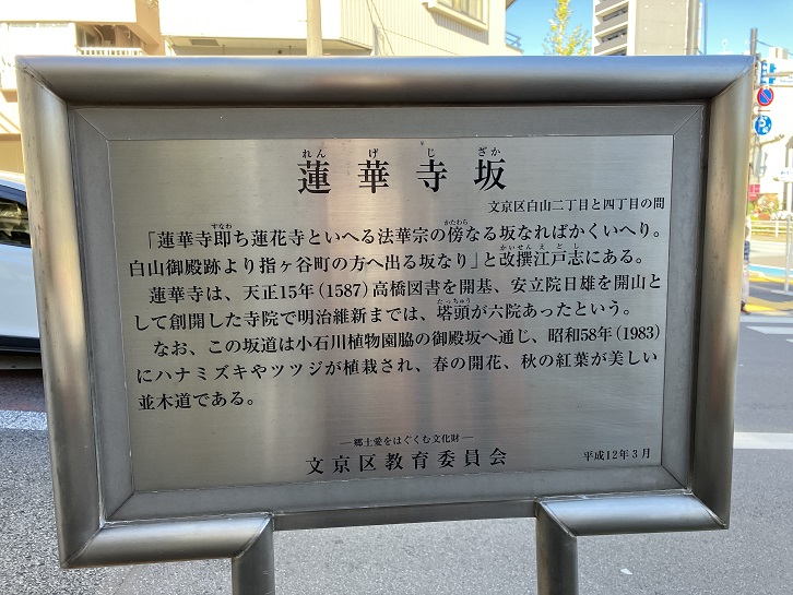 蓮華寺坂は愛星幼稚園付近から白山下交差点に下る坂で、長さ約150mほどのやや急な坂になっています。坂名の由来は、坂下で蓮華寺の横を通ることに因んでいます。別名が蓮花寺坂とか御殿裏門坂になっていますが、御殿裏門とは白山御殿の裏手にある坂という意味です。