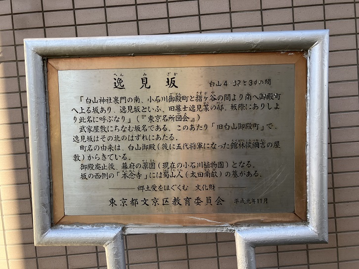 「白山神社裏門の南、小石川御殿町と指ヶ谷の間より南へ御殿町へ上る坂あり、逸見坂といふ、旧幕士逸見某の邸、坂際にありしより此名に呼ぶなり」(「東京名所図会」)。武家屋敷にちなむ坂名である。このあたり「旧白山御殿町」で、逸見坂はその北のはずれにあたる。町名の由来は、白山御殿(後に五代将軍になった館林侯綱吉の屋敷)からきている。御殿廃止後、幕府の薬園(現在の小石川植物園)となる。坂の西側の「本念寺」には蜀山人(太田南畝)の墓がある。