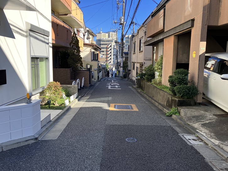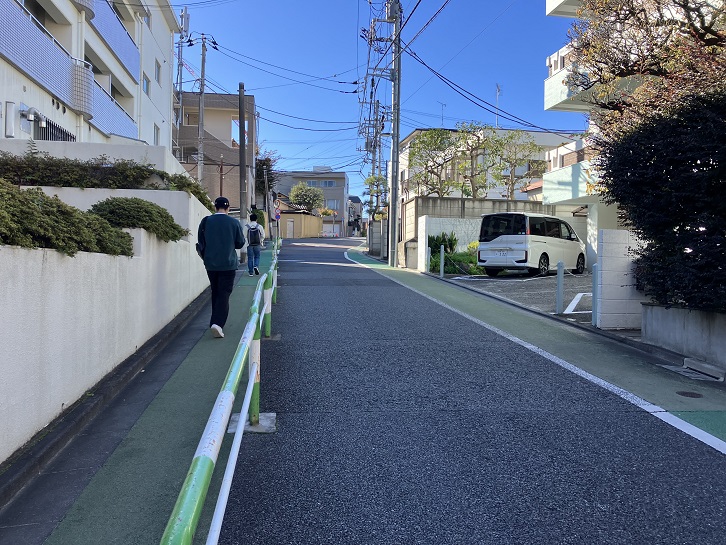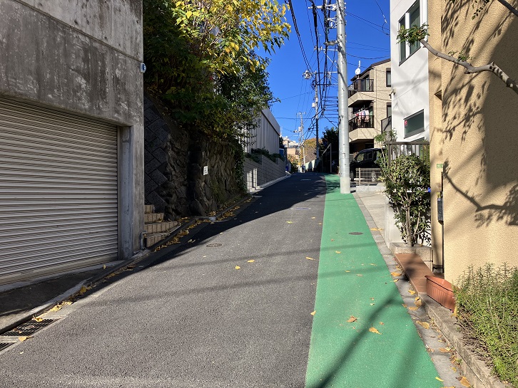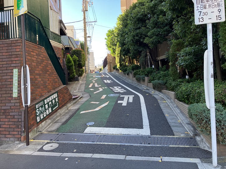 御殿坂の坂上から平坦な道を進みますと、白山通りの白山下交差点に下る坂があります。