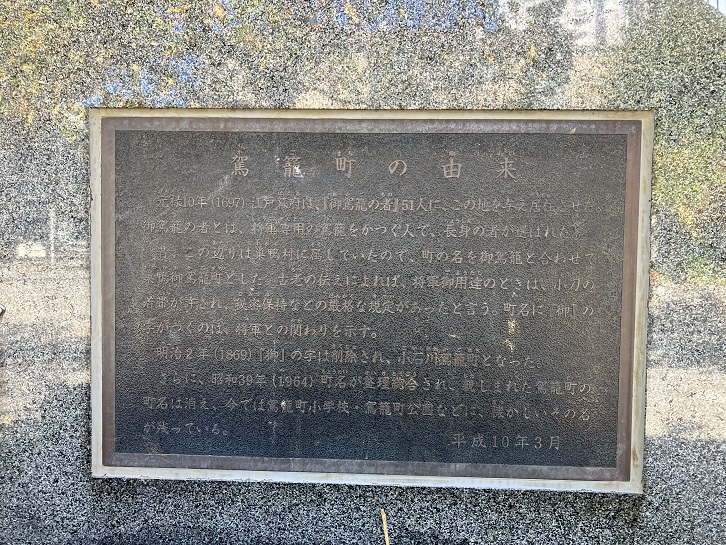 元禄十年(1697年)江戸幕府は、「御駕籠の者」51人に、この地を与え居住させた。御駕籠の者とは、将軍専用の駕籠をかつぐ人で、長身の者が選ばれた。昔、この辺りは巣鴨村に属していたので、町の名を御駕籠と合わせて巣鴨御駕籠町とした。古老の伝えによれば、将軍御用達のときは、小刀の着帯が与され、秘密保持などの厳格な規定があったと言う。町名に「御」の字がつくのは、将軍との関わりを示す。明治二年(1869年)「御」の字は削除され、小石川駕籠町となった。さらに、昭和三十九年(1964年)町名が整理統合され、親しまれた駕籠町の町名は消え、今では駕籠町小学校・駕籠町公園などに、懐かしいその名が残っている。