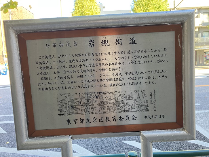 この街道は、江戸のころ将軍が日光東照宮にお参りする時に通る道であることから”将軍御成道”といわれ、重要な道路の一つであった。人形のまち・岩槻に通じている道で”岩槻街道”という。現在の東京大学農学部前の本郷追分で、旧中山道とわかれ、駒込へと直進し、王子・岩渕を経て荒川を渡り、岩槻へと向かう。将軍は、江戸城を発ち、岩槻に一泊し、さらに古河城、宇都宮城に泊って日光に入ったといわれている。将軍がこの街道を通る時の警備は厳重で、沿道に住む人達は、大そう不自由なおもいもしたという逸話が残っている。現在の名は”本郷通り”である。