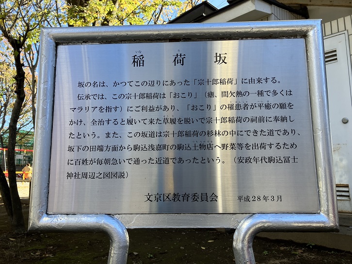 稲荷坂は、駒込稲荷坂下交差点から本駒込四丁目と五丁目の境界を南方向に上がる長さ約270mほどの坂で、坂上近くの神明公園の前辺りがかなり急な坂になっています。坂名は、坂上にあった旧家の高木家に祀られていた「宗十郎稲荷」に由来します。