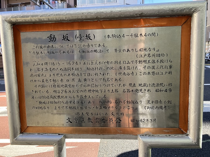 「千駄木に動坂の号あるは、不動坂の略語にて、草堂ありし旧地なり」(「江戸名所図会」)。坂上の北側に日限地蔵堂があったが、ここは目赤不動尊の旧跡である。三代将軍家光の目にとまり、本駒込に移った。これが江戸時代有名な五色不動の一つ目赤不動を祀る南谷寺である。