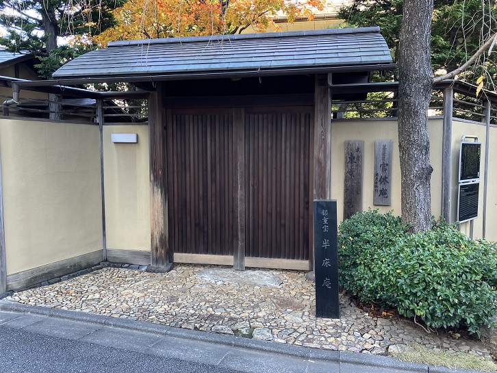 狸坂の坂上を左折して小道を進みますと、左手に趣のある門の奥に建物があります。半床庵という茶席なのだそうです。茶席とは、茶の湯の会を催す席のことで、茶座敷とか茶室ともいわれます。その催しは茶会と呼ばれます。門が閉っていて中は見えませんでしたが。