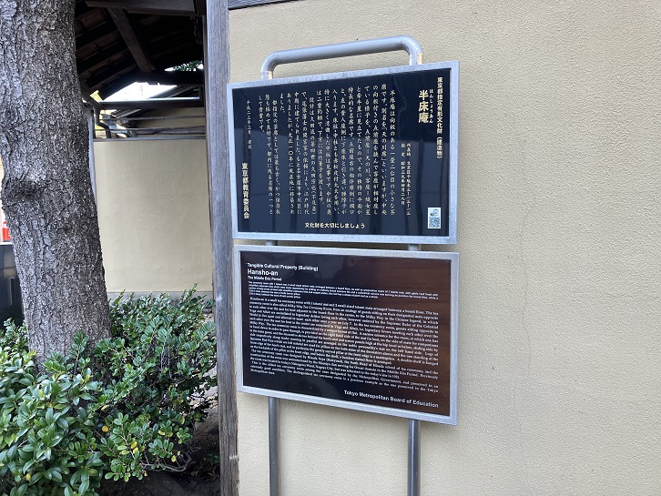 Hansho-an is a small tea ceremony room with 1 tatami mat and 2 small sized tatami mats arranged between a board floor. The tea ceremony room is also called Milky Way Tea Ceremony Room, from an analogy of guests sitting on their designated mats opposite to each other over the mat for host adjacent to the board floor in the center, to the Milky Way in the Chinese legend, in which Vega and Altair are assimilated to legendary deities loving each other, however ordered by the Supreme Ruler of the Celestial World to live apart and allowed to meet each other once a year on July 7. In the tea ceremony room, guests sitting opposite to each other over the mat for host in the center are compared to Vega and Altair, i.e. legendary lovers meeting each other over the Milky Way. The tea ceremony room is characterized by a unique layout of flat. A narrow entrance for the room, at which one has to bend down in order to pass through, is provided on the right hand side of the mat for host, on the side of mats for companions to the main guest, and the decorative alcove behind the host's mat and screen panels high at the hip level or below, sliding side by side respectively along tracks running in parallel are arranged on the noble personality's mat on the left hand side. Logs of Japanese Red Pine which are left natural are used for pillars on the both sides of the decorative alcove and the one standing at the front edge of the host's mat, and in particular the greatly curved pillar at the front edge is a masterpiece. A double shelf is hanged on the backside of the pillar at the front edge, and below the shelf, a bamboo slatted floor is arranged. The tea ceremony room was designed by Hisada Soya (Hukyusai), the Forth Head of Hisada school of tea ceremony, and the