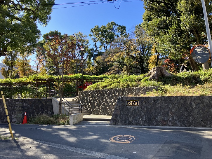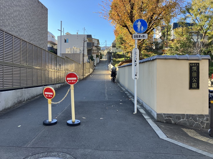 千駄木駅の北側から不忍通りを一歩入った奥に、金ピカの文字で書かれたプレートが石垣にはめ込まれた須藤公園があります。須藤公園は、須藤家から東京市に寄付された庭園を生かした公園で、高低差のある台地と低地を巧みに生かした公園斜面地には、クスノキなどの大木が豊かな緑をつくりだしています。またその緑を背景として、滝からの水が流れ込む池には藤棚が設けられています。斜面地はササを主体とした植栽となっていますが、野草も生育し、春には可憐な花を咲かせます。須藤公園の敷地は江戸時代の加賀藩の支藩だった大聖寺藩(十万石)の屋敷跡になっています。その後、長州出身の政治家品川弥二郎の邸宅となり、明治二十二年(1889年)に実業家須藤吉左衛門が買い取りました。昭和八年(1933年)に須藤家が公園用地として東京市に寄付し、昭和二十五年(1950年)に文京区に移管されました。その須藤公園の南側に沿って西に上る急坂があります。