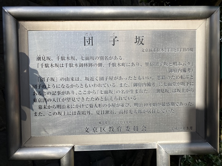 「千駄木坂は千駄木御林跡の側、千駄木町にあり、里俗団子坂と唱ふ云々」(御府内備考)。「団子坂」の由来は、坂近く団子屋があったともいい、悪路のため転ぶと団子のようになるからともいわれている。また、「御府内備考」に七面堂が坂下にあるとの記事があり、ここから「七面坂」の名が生まれた。「潮見坂」は坂上から東京湾の入江が望見できたためと伝えられている。幕末から明治末にかけて菊人形の小屋が並び、明治四十年頃が最盛期であった。また、この坂上には森鴎外、夏目漱石、高村光太郎が居住していた。