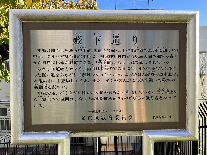 本郷台地の上を通る中山道(国道17号線)と下の根津谷の道(不忍通り)の中間、つまり本郷台地の中腹に、根津神社裏門から駒込方面へ通ずる古くから自然に出来た脇道である。「藪下道」ともよばれて親しまれている。むかしは道幅もせまく、両側は笹藪で雪の日には、その重みでたれさがった笹に道をふさがれて歩けなかったという。この道は森鴎外の散歩道で、小説の中にも登場してくる。また、多くの文人がこの道を通って鴎外の観潮楼を訪れた。現在でも、ごく自然に開かれた道のおもかげを残している。団子坂上から上富士への区間は、今は「本郷保健所通り」の呼び方が通り名となっている。