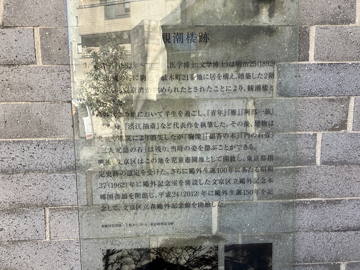 森鴎外(1862年〜1922年、医学博士、文学博士)は明治二十五年(1892年)30歳の時に駒込千駄木町21番地に居を構え、増築した2階部分から東京湾が眺められたとされたことにより、観潮楼と名付けた。鴎外はこの地において半生を過ごし、「青年」・「雁」・「阿部一族」・「高瀬舟」・「渋江抽斎」など代表作を執筆した。その後、建物は火災や戦災により消失したが「胸像」・「銀杏の木」・「門の石畳」・「三人冗語の石」は残り、当時の姿を偲ぶことができる。戦後、文京区はこの地を児童遊園地として開放し、東京都指定史跡の認定を受けた。さらに鴎外生誕100年にあたる昭和三十七年(1962年)に鴎外記念室を併設した文京区立鴎外記念本郷図書館を開館し、平成二十四年(2012年)に鴎外生誕150年を記念して、文京区立森鴎外外記念館を開館した。