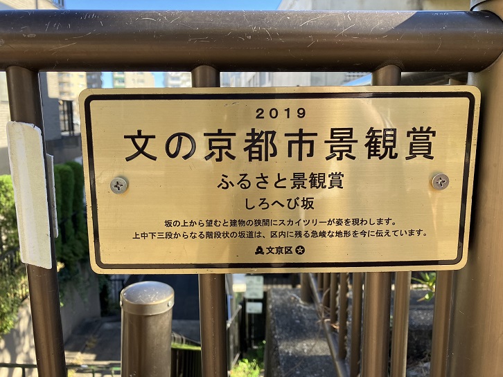 春日駅を出て、春日町交差点を左折して白山通りを北上します。指ケ谷小入口交差点を左折して路地に入りますと、曲がりくねった路地の先に坂道が上がっています。ちなみに、「指ケ谷」にはいわれがあります。現在の白山一丁目〜五丁目(三丁目は除く)の町域はかっては「指ケ谷町」という地名でした。白山通りの歩道脇に旧町名の由来を記した案内板が立っています。