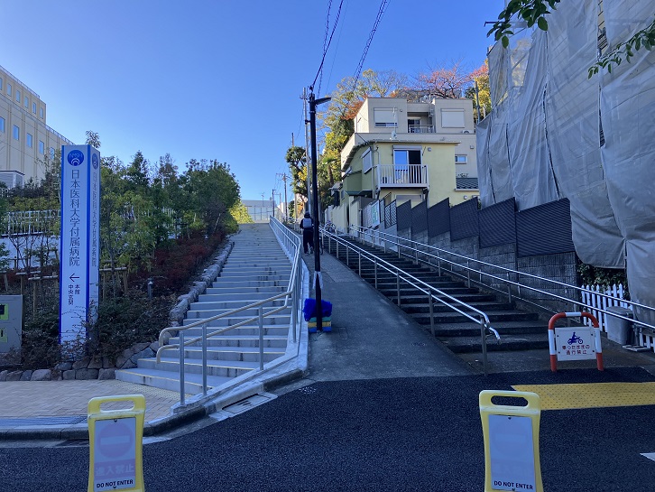 藪下通りが日医大つつじ通りに突き当たる手前の日本医科大学付属病院の北側に長い階段が上がっています。