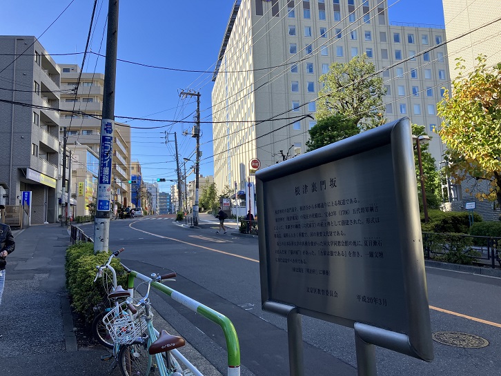 根津裏門坂は根津神社の裏門前を本郷通りから根津の谷に下る緩やかな坂で、長さは約270mほどあります。根津神社の裏門前にあることでこの名前が付きました。根津神社裏門の鳥居前に案内板が立っています。
