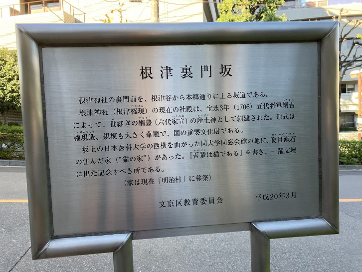 根津神社の裏門前を、根津谷から本郷通りに上る坂道である。根津神社(根津権現)の現在の社殿は、宝永三年(1706年)五代将軍綱吉によって、世継ぎの綱豊(六代家宣)の産土神として創建された。形式は権現造、規模も大きく華麗で、国の重要文化財である。坂上の日本医科大学の西横を曲がった同大学同窓会館の地に、夏目漱石の住んだ家(“猫の家”)があった。「吾輩は猫である」を書き、一躍文壇に出た記念すべき所である。(家は現在「明治村」に移築)