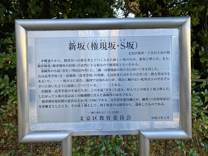 S坂は、根津神社の正面の大鳥居前から東京大学野球場の裏側を上る長さ約140mほどのやや急な坂で、坂下部分がS字形に曲がっています。坂道の形がS字状であるために、森鴎外が命名して旧一高生たちがこの名で呼んだのが坂名の由来になっています。別名を権現坂または新坂といいます。権現坂は根津権現に因むものと思われます。坂下の大鳥居脇に案内板が立っています。