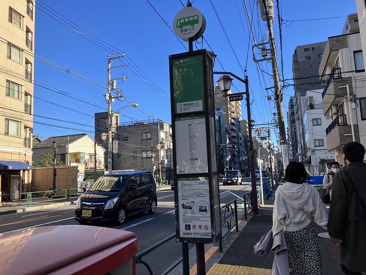 S坂の近くには「お化け階段」なる坂道があるそうです。でも事前調査が不十分で、どうやったら辿り着けるのかわかりません。S坂の遙か先まで行ったのですが、それらしき階段は見つかりません。諦めて今日はS坂で終わりにしたいと思います。根津神社から不忍通りに出ました。ここは地下鉄千代田線の千駄木駅と根津駅のちょうど中ほどに位置しています。どちらから帰ろうかと迷ったのですが、目の前に根津神社入口の都営バスの停留所があります。今日は結構歩いたし、駅まで行くのもかったるいので、軟弱にも都バスに乗って帰ることにします。帰ってから調べてみたら、お化け階段は根津神社の大鳥居近くから路地に入れば直ぐのところにあることが分かりました。残念!