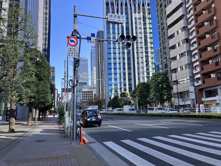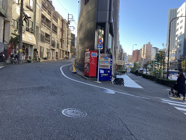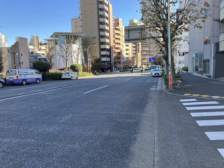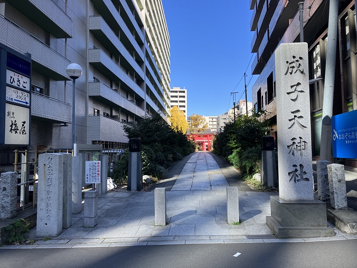 成子天神下交差点と成子坂下交差点の間から北東方向に道路が延びています。その先は税務署通りを越えて、更に北上して緩やかにカーブした坂になっています。