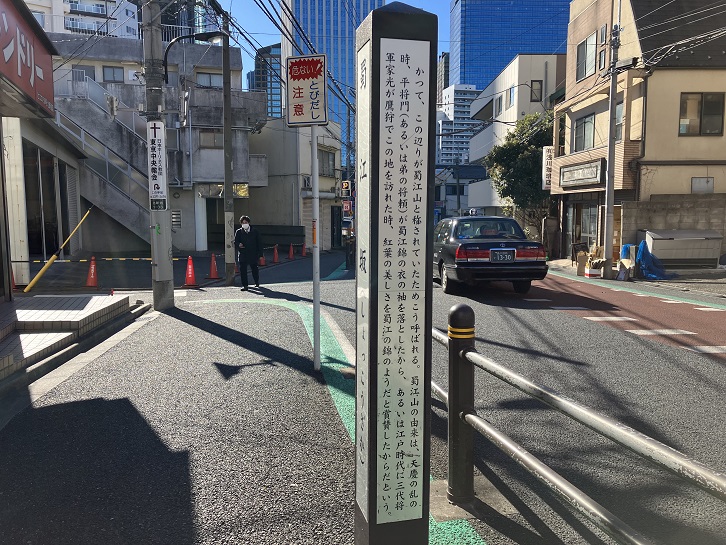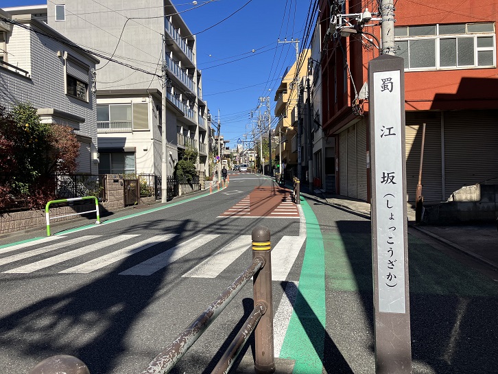 蜀江坂は、創価学会新宿池田文化会館の西側に沿ってS字状に曲がりながら北に向かう坂で、長さは約140mほどあります。かつて此の地が蜀江山と称されていたことが坂名の由来になっています。坂下と坂上に案内柱が立っています。蜀江錦とは、三国志の英雄である劉備が治めた中国の蜀の国(四川省)で製作された錦のことです。蜀の成都の東南角は古代から錦の産地として有名で、その地方を流れる川を錦江といいました。その川の水が染色に適し、鮮明な色彩を染め出したことから、蜀江錦の名前になったといわれています。