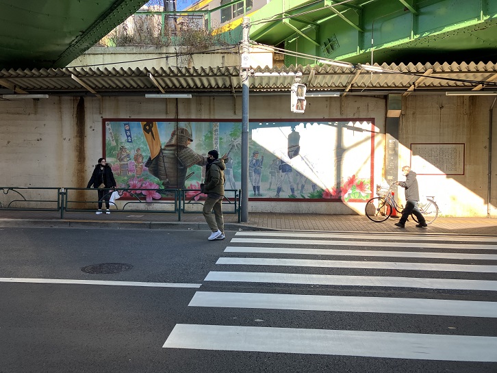 蜀江坂上から路地を抜けて大久保通りに出ます。大久保駅北口改札向かいのガード下の壁には巨大な百人組鉄砲組の壁画が描かれています。駅近くにある日本電子専門学校の有志一同により、数年ごとに描かれているのだそうです。この壁画の製作には、日本電子専門学校CG科を卒業し、ゲームクリエイターを経て漫画家になった井上淳哉氏も参加していましたが、その時に描いた壁画は1998年頃に今の壁画が描かれた際に塗り潰されてしまったとのことです。