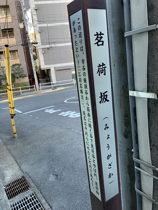 この辺りは、市谷の饅頭谷から西南に続く谷で茗荷谷と呼ばれ、茗荷畑があったという(「江府名勝志」)。坂名はそれらにちなんだのであろう。
