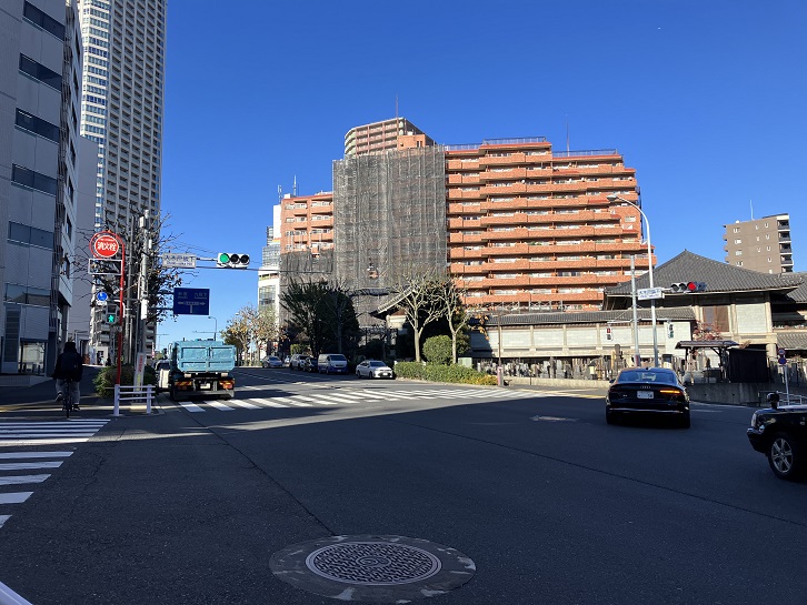 大久保駅の北側の道路を抜けて、西武新宿駅の横で靖国通りに出ます。靖国通りを東方向に進んで、先日訪れた安保坂のある富久町西交差点に到着します。外苑西通りに入りますと、交差点の左脇のお寺の間に坂が下っています。