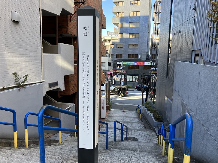 暗坂は別名を「くらがり坂」と呼ばれ、長さは約120mほどあります。江戸時代には、坂の左右に樹木が繁って暗かったためにこの坂名が付けられました。暗坂の入口の手前にある急階段の階上に案内柱が立っています。