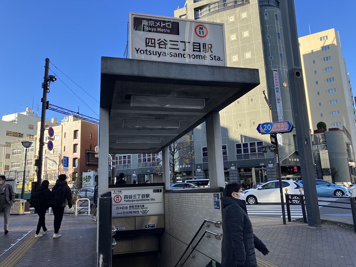 今日は曙橋駅をゴールにしようかと思っていたのですが、新坂を抜けて外苑東通りに出てしまいましたので、今日のゴール地点は四谷三丁目駅とします。四谷三丁目駅の出入口は幾つかあり、外苑東通りから来ると出入口2が近いのですが、この後に用事があったので新宿通りの反対側にある交差点角の出入口1に向かいます。駅の階段を下りようとしたら誰かに腕を捉まえられました。誰だろうと振り向いたら、ナント高校時代の同級生でした!正に偶然も偶然!確率的には千兆分の一位といっていいでしょう。元々乗る予定のなかった丸ノ内線、たまたま使った四谷三丁目駅・それも出入口1、人通りでごった返す交差点の角、四谷はたまたま用事で通りかかった同級生、ちょっと道草したら遭遇しなかったであろう時刻、まさに奇跡でした。言葉を交わしただけで別れましたが、こんな大都会の東京でこんな偶然もあるんですね!