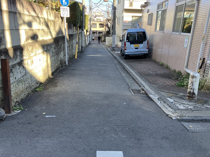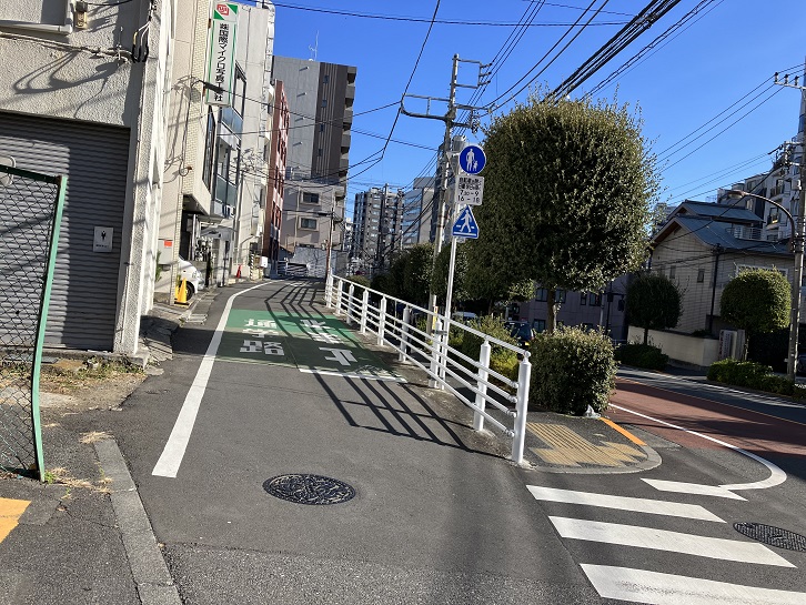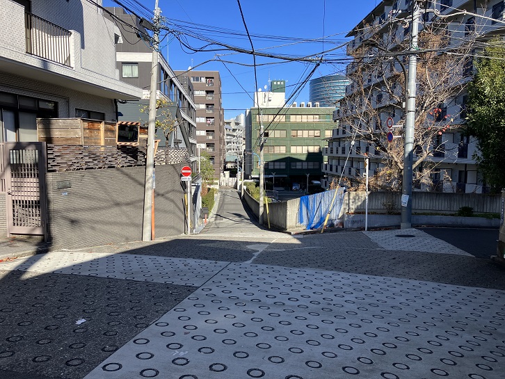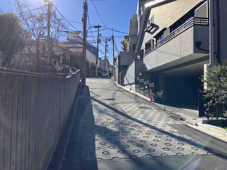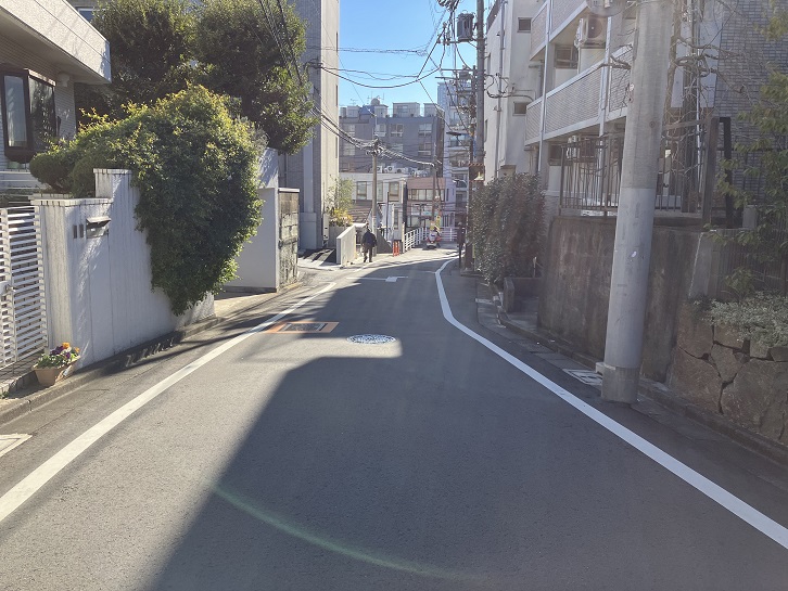 大久保通りから分岐した道路の先に、白金公園の手前から緩やかな坂が曲がりながら上がっています。