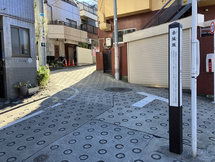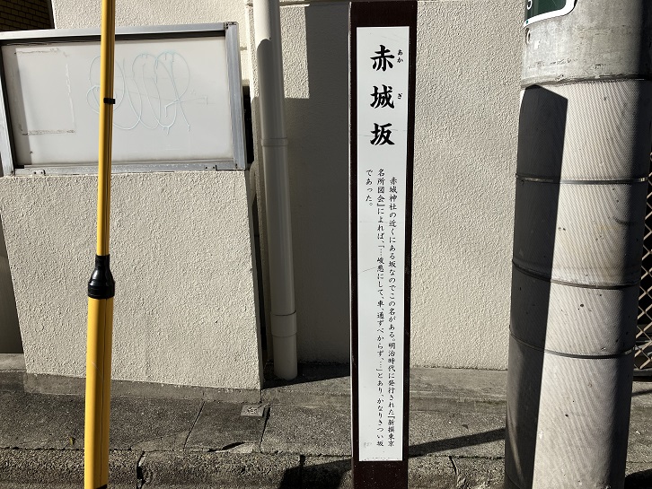 赤城坂は長さが約140mほどで、坂名は赤城神社の近くの坂ということに由来します。坂上と坂の途中の曲がり角に案内柱が立っています。