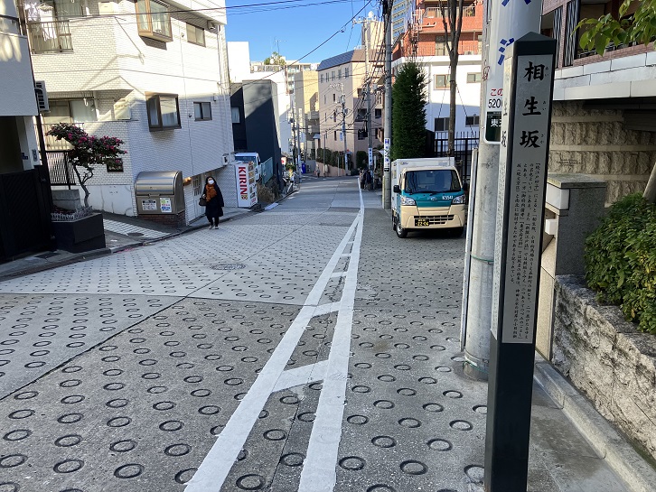 相生坂(東側)は東五軒町と白銀町の間を通っており、長さは約100mほどのやや急な坂です。西側の坂と並んでふたつあるので「相生坂」という名前になりました。