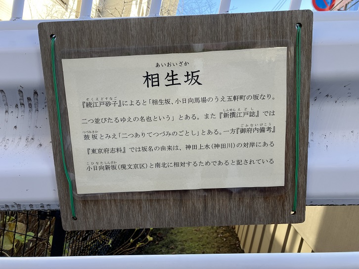 「続江戸砂子」によると「相生坂、小日向馬場のうえ五軒町の坂なり。二つ並びたるゆえの名也という」とある。また「新撰江戸誌」では鼓坂とみえ「二つありてつづみのごとし」とある。一方「御府内備考」・「東京府志料」では坂名の由来は、神田上水の対岸の小日向新坂(現文京区)と南北に相対するためであると記されている。