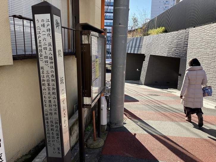 御殿坂は、築土八幡神社の脇から大久保通りに下る急坂です。長さは約60mほどで、途中で少し逆”く”の字に曲がっています。坂名は、江戸時代に坂の西側に将軍家光の世子家綱の御殿があり、そこが御殿山と呼ばれたことに由来します。坂上と坂下付近に案内柱が立っています。