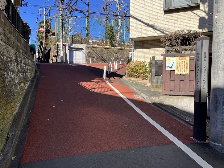 瓢箪坂は長さ約40mほどの坂です。坂名は、坂の途中で瓢箪のような形に括れていることに由来します。 坂下に案内柱が立っています。