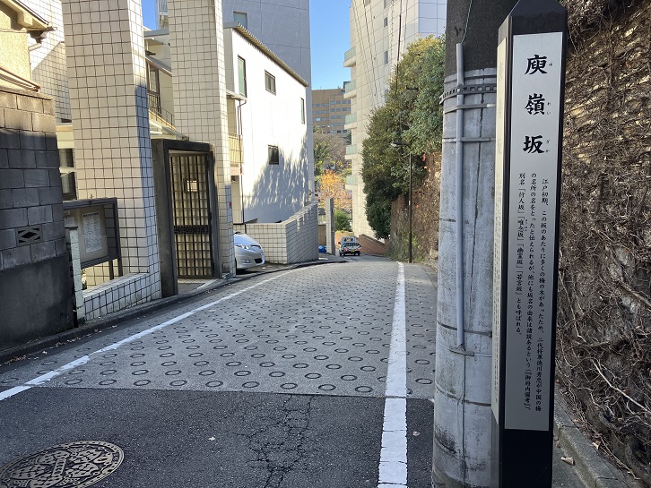庚嶺坂は、「ゆれいざか」と読みます。別名として、若宮坂・行人坂・祐玄坂などと呼ばれています。外堀通りから飯田橋レインボービルの手前で北西方向に延び、若宮八幡神社に向かう坂です。長さは約120mほどあり、僅かに右側に曲がりながら上る急坂になっています。坂名は、このあたりが美しい梅林であったために、中国の梅の名所(大庚嶺)に因んで名付けられました。坂下と坂上に案内柱が立っています。