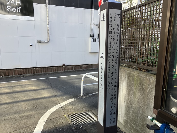 昔、小野美佐吾という人が武蔵守となり、この地にきた時、美しい娘と恋仲になり、のちに都に帰って没したが、娘の夢によりこの坂で、再び逢ったという伝説に因み、逢坂と呼ばれるようになったという。