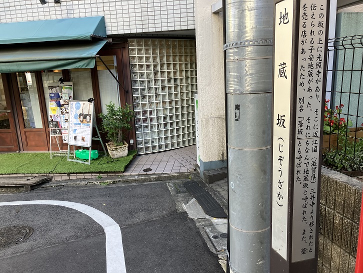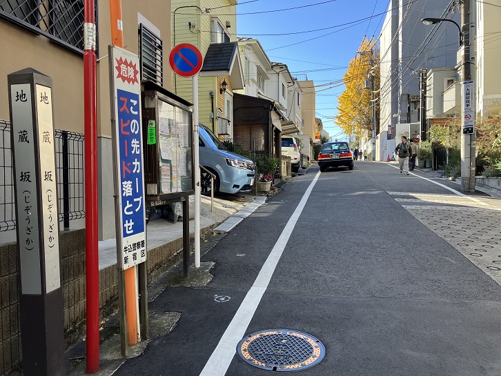 地蔵坂は神楽坂通りから善國寺の脇に入って、途中で右側に曲がりながら光照寺に向かって上る急坂です。別名を「藁坂」といい、長さは約120mほどあります。坂名は、坂上の光照寺に子安地蔵があることに因んでいます。坂の途中の曲がり角と坂上付近に案内柱が立っています。