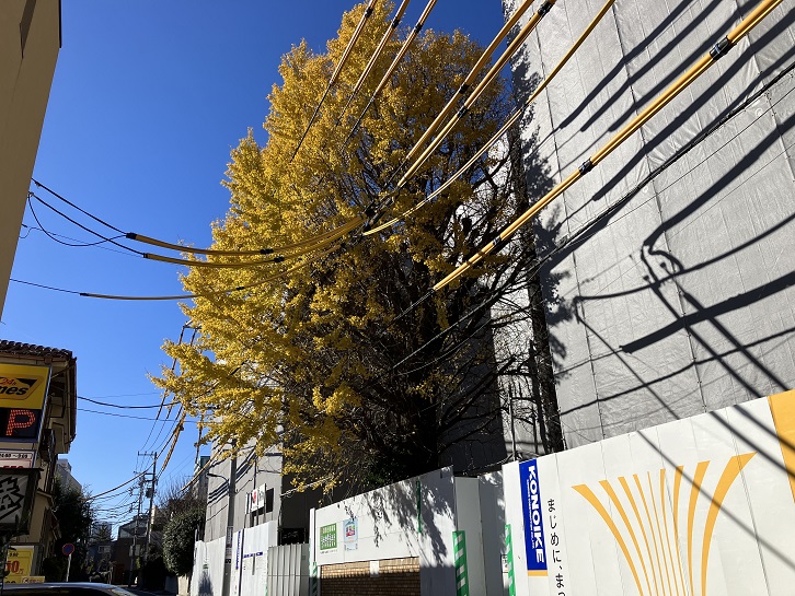 地蔵坂の坂上には工事中の塀に囲われ、大きな銀杏の木が聳えています。樹齢250年以上と推定され、戦災の時に焼け野原となった中にこの銀杏の木が残り、それを目印に被災者の人が戻ってきたといわれています。幹には戦災の時の空襲の痕跡(裂け目)が残っています。「日本出版クラブのイチョウ」と呼ばれていましたが、日本出版クラブは2018年に神保町に移転し、現在は跡地にマンションが建設中です。