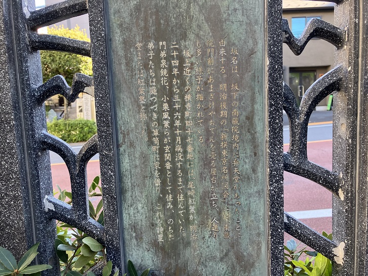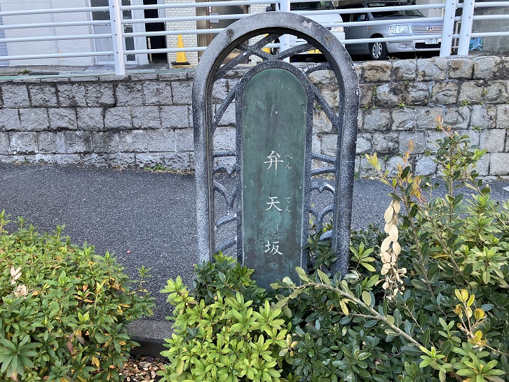 坂名は、坂下の南蔵院境内に弁天堂があったことに由来する。明治後期の「新撰東京名所図会」には、南蔵院門前にあまざけやおでんを売る屋台が立ち、人通りも多い様子が描かれている。坂上近くの横寺町四十七番地には、尾崎紅葉が、明治二十四年から三十六年十月病没するまで住んでいた。門弟泉鏡花、小栗風葉らが玄関番として住み、のちに弟子たちは庭つづきの箪笥町に家を借り、これを詩星堂または紅葉塾と称した。