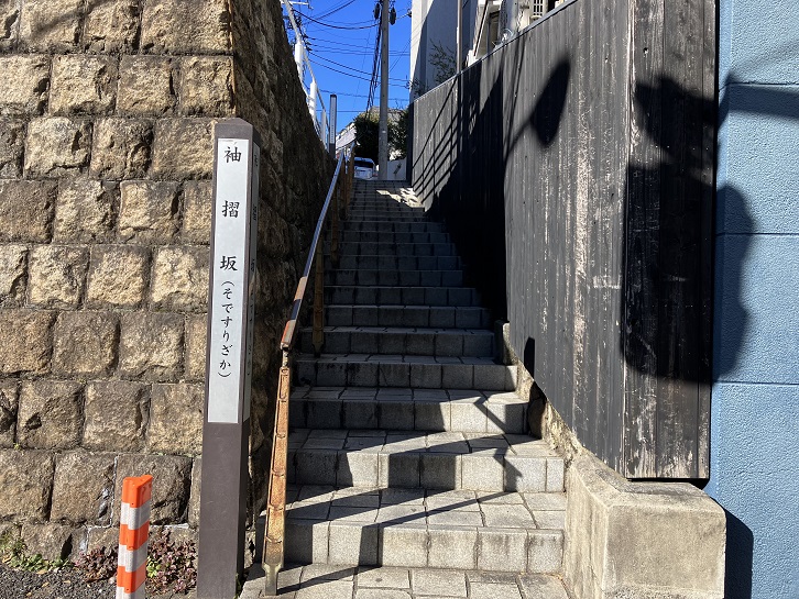 袖摺坂は長さが10mほどの細い階段です。坂名の由来は、狭い坂道であったために、坂道を上り下りする人が互いに袖を摺り合わされるほどだったことに因んでいます。