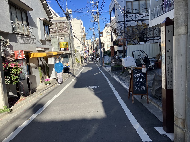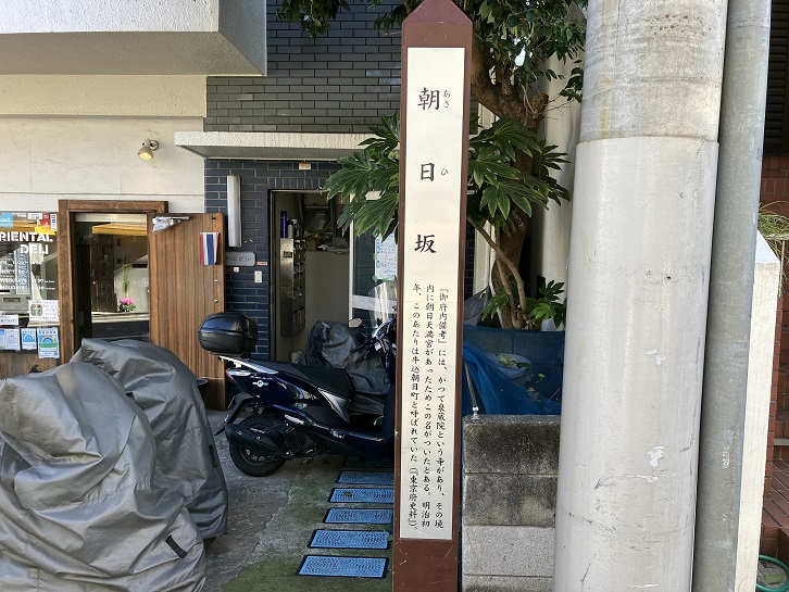 朝日坂は長さが約140mほどの緩やかな坂です。かってこの坂の近くに泉蔵院という寺があり、その境内に朝日天神があったために、この辺りは旭町と呼ばれていました、坂名の由来は、この朝日天神に因んでいます。坂の途中に案内柱が立っています。