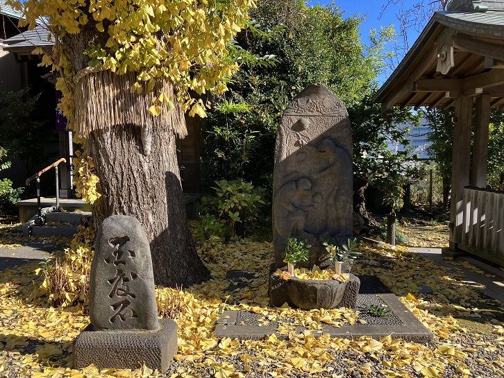 樹齢250年以上のイチョウの木。戦時中、焼け野原となった街にこのイチョウが焼け残っており、それを目印に被災した人々が戻ってきたといわれています。幹には戦災の時の傷(裂け目)が残っており、そこからトウネズミやケヤキが生えており、生命力を感じさせます。イチョウやシイの水は水分を多く含むため、焼失せず残った木が今も数多く区内に存在しています。