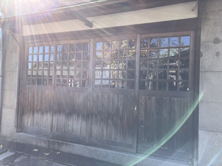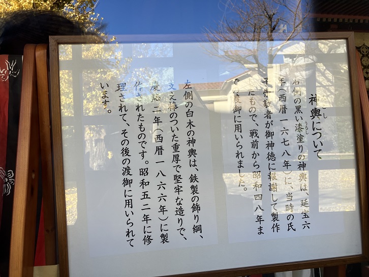 境内の神輿庫には、新旧2基の神輿が鎮座しています。ガラス戸越してよく見えませんが。