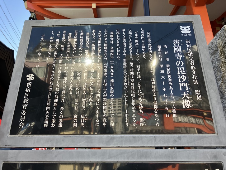 「神楽坂の毘沙門さま」として、江戸時代より信仰をあつめた毘沙門天立像である。木彫で像高三十センチ、右手に鉾、左手に宝塔を持ち、磐座に起立した姿勢をとる。造立時期は室町時代頃と推定されるが、詳しくは不明である。加藤清正の守本尊だったとも、土中より出現したともいわれる。善國寺は、文禄四年(1595年)徳川家康の意を受けて日惺上人により創建された。この像は、日惺上人が鎮護国家の意をこめて当山に安置したもので、上人が池上本門寺に入山するにあたり、二条関白昭実公より贈られたと伝えられる。毘沙門天は、別名を多聞天と称し、持国天・増長天・広目天と共に四天王の一つである。寅の年、寅の月、寅の日、寅の刻に世に現れたといい、北方の守護神とされる。善國寺の毘沙門天は、江戸の三毘沙門と呼ばれ、多くの参詣者を集め、明治・大正期には東京でも有数の信仰地として賑わった。現在も、正月・五月・九月の初寅の日に毘沙門天を開帳し、賑わいを見せている。