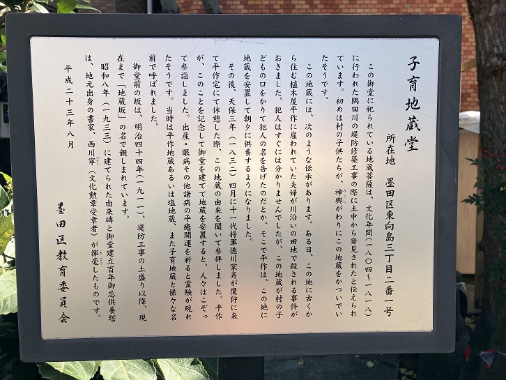 この御堂に祀られている地蔵菩薩は、文化年間(1804年〜1818年)に行われた隅田川の堤防修築工事の際に土中から発見されたと伝えられています。初めは村の子供たちが、神輿がわりにこの地蔵をかついでいたそうです。この地蔵には、次のような伝承があります。ある日、この地に古くから住む植木屋平作に雇われていた夫婦が川沿いの田地で殺される事件がおきました。犯人はすぐには分かりませんでしたが、この地蔵が村の子どもの口をかりて犯人の名を告げたのだとか。そこで平作は、この地に地蔵を安置して朝夕に供養するようになりました。その後、天保三年(1832年)四月に十一代将軍徳川家斉が鷹狩に来て平作宅にて休憩した際、この地蔵の由来を聞いて参拝しました。平作が、このことを記念して御堂を建てて地蔵を安置すると、人々はこぞって参詣しました。出産・眼病その他諸病の平癒開運を祈ると霊験が現れたそうです。当時は平作地蔵あるいは塩地蔵、また子育地蔵と様々な名前で呼ばれました。御堂前の坂は、明治四十四年(1911年)、堤防工事の土盛り以降、現在まで「地蔵坂」の名で親しまれています。昭和八年(1933年)に建てられた由来碑と御堂建立百年御忌供養塔は、地元出身の書家、西川寧(文化勲章受章者)が揮毫したものです。