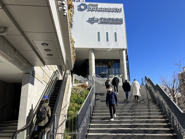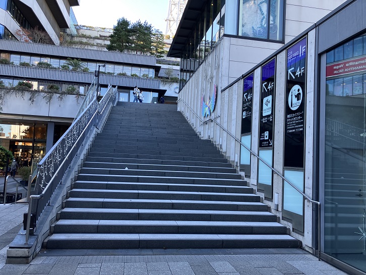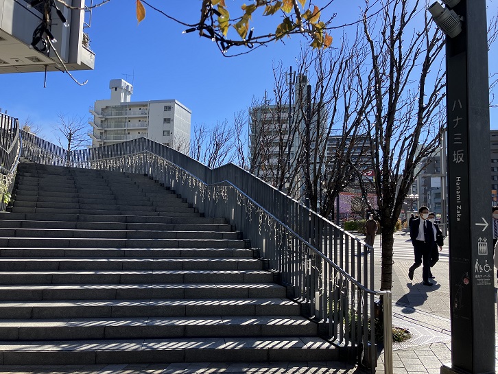 ハナミ坂は東京スカイツリーの西側(すみだ水族館側)からウェストヤードの4階まで上る階段で、長さは約70m(約110段)ほどあります。途中にある踊り場を挟んで8つの階段に分かれています。階段の横には並行してエスカレーターが併設されています。