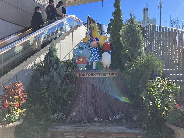 階段下では、東京スカイツリーの公式キャラクターである、ソラカラちゃんとテッペンペンとスコブルブルがお出迎えしています。