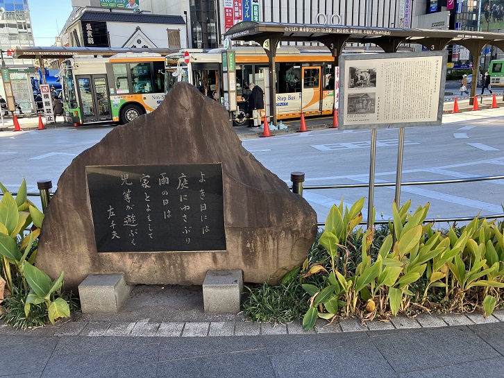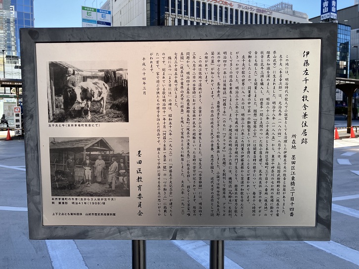 錦糸町は今でこそ下町の大人の繁華街となって賑わっていますが、明治時代には牧場もある長閑な東京の郊外でした。駅前に伊藤左千夫が営んでいた牧舎の案内板が立っています。