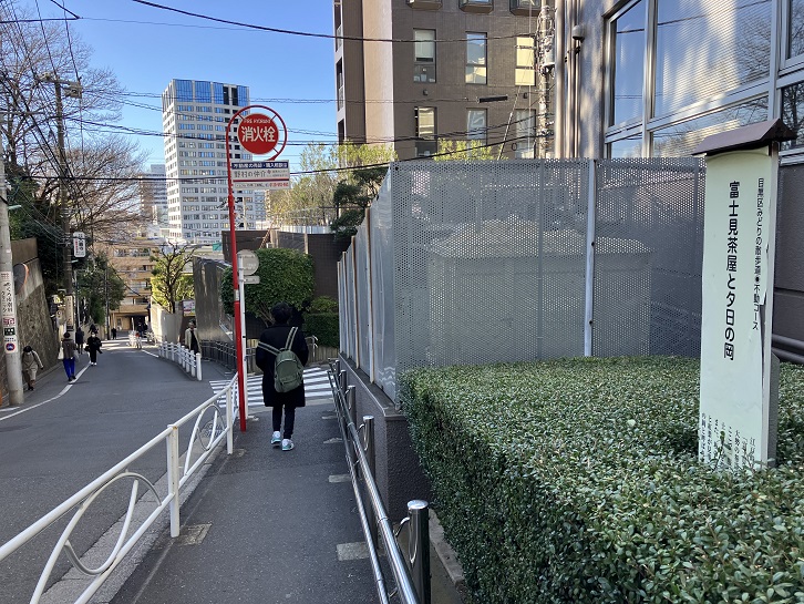 坂の中腹に案内板が立っています。高い建物がなかった江戸時代には、坂上からの眺望が素晴らしかったことでしょう。
