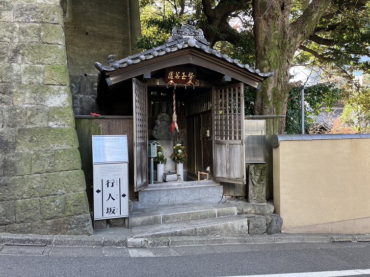 寛永の頃、出羽(山形県)の湯殿山の行人が、このあたりに大日如来堂を建立し修行を始めました。しだいに多くの行人が集まり住むようになったので、行人坂と呼ばれるようになったといわれています。